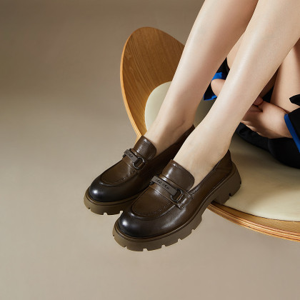真皮女鞋春季气质百搭圆头粗跟厚底单鞋女复古英伦小皮鞋乐福鞋女