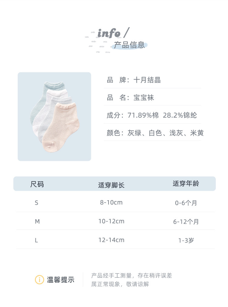 适用季节: 春,夏 安全等级: A类 面料: 详见材质 适用年龄: 0-6个月,6-12个月,1-3岁 厚薄: 薄 适用人群: 婴童,幼童 规格数量: 多件 适用性别: 男童,女童 生产/经销/进口厂家: 绍兴施腾日用品有限公司 厂家地址: 浙江省绍兴市上虞区小越街道胜桥村 详细材质信息: 成分:脚面:71.89%棉28.2%锦纶 主款式: 短筒袜 执行标准: FZ/T73025-2019 商品编码: WPFSH1860-1