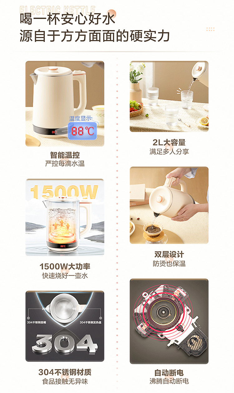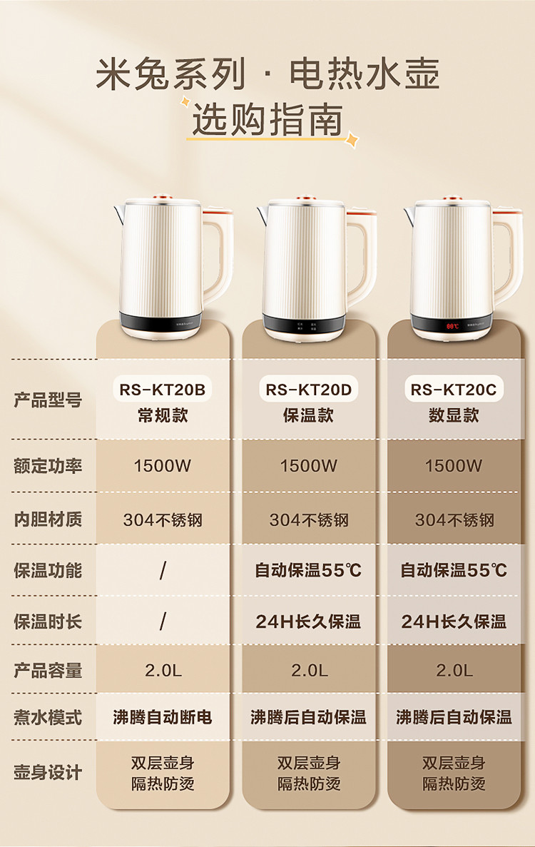 容量.: 1.6L-2.0L 材质: 304不锈钢 容量: 2L 功能: 自动断电,过热保护 功率.: 1500W 保温功能: 支持 显示方式: 指示灯 加热方式: 底盘加热 适用季节: 春,夏,秋,冬 壶体层数: 双层 电源线长度(m): 0.75左右 生产/经销/进口厂家: 合肥荣事达小家电有限公司 厂家地址: 安徽省合肥市双凤工业区荣事达第六工业园 主分类: 电热水壶 具体容量: 2L 执行标准: GB4706.1-2005 GB4706.19-2008 产地: 中国 商品配件: 电源线*1件/双/个; 商品编码: KT2OC