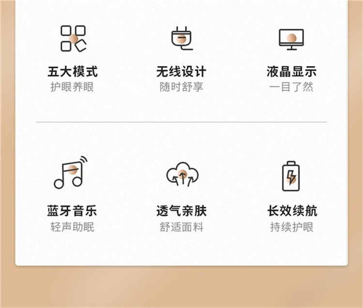 功能: 局部热疗,按摩强度调节,收纳式局部按摩器 理疗方式分类: 气压式按摩,温热,指压式按摩,振动按摩 触头种类: 无触头,气囊型按摩头 电源类型: 充电式 按摩头个数: 4个以上 可选档位: 1档 附加功能: 蓝牙 适用季节: 春,夏,秋,冬 生产/经销/进口厂家: 合肥荣事达智家科技有限公司 送礼对象: 送爱人,送长辈,送男士,送女士 厂家地址: 安徽省合肥市双凤经济开发区荣事达 第六工业园 执行标准: GB4706.10-2008 送礼节日: 情人节,母亲节,520,父亲节,七夕,圣诞 产地: 中国 商品卖点: 淡化黑眼圈缓解眼疲劳 洗涤说明: 否 商品配件: 电源线*1件/双/个;礼盒*1件/双/个;说明书*1件/双/个; 商品编码: RSD-318D