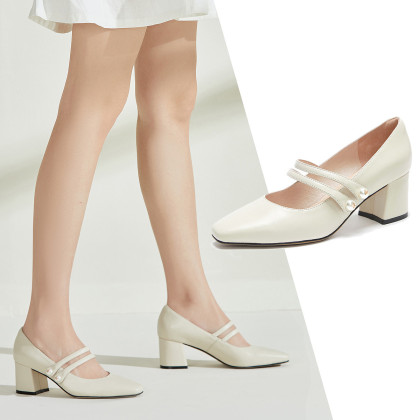 羊皮女鞋春百搭气质小方头浅口粗跟单鞋女中跟通勤玛丽珍鞋女