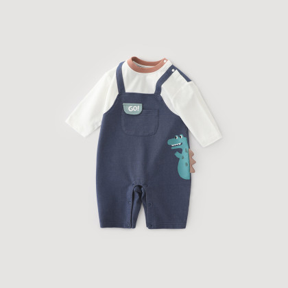 男宝宝春装2025超萌可爱背带假两件哈衣爬服春秋婴儿连体衣